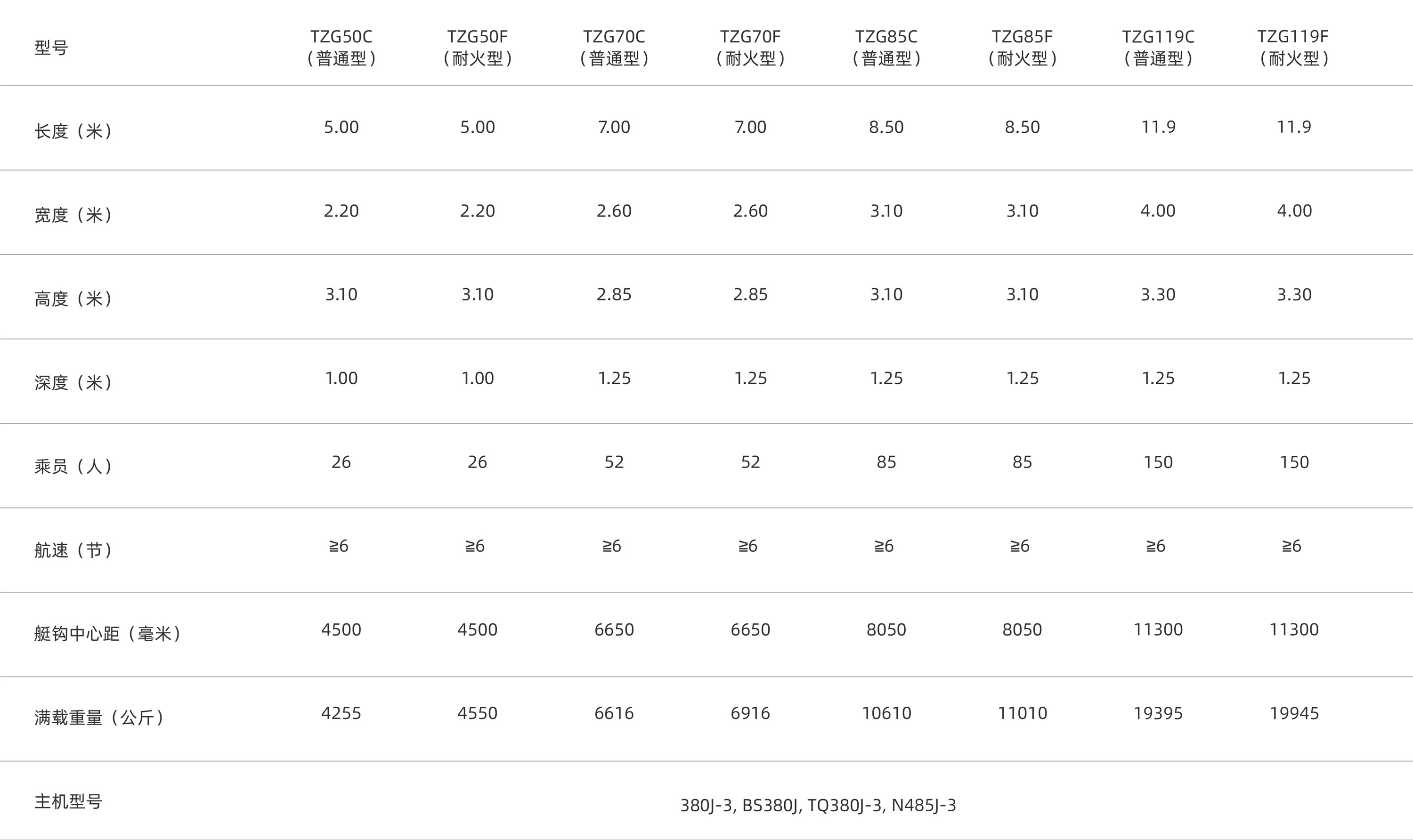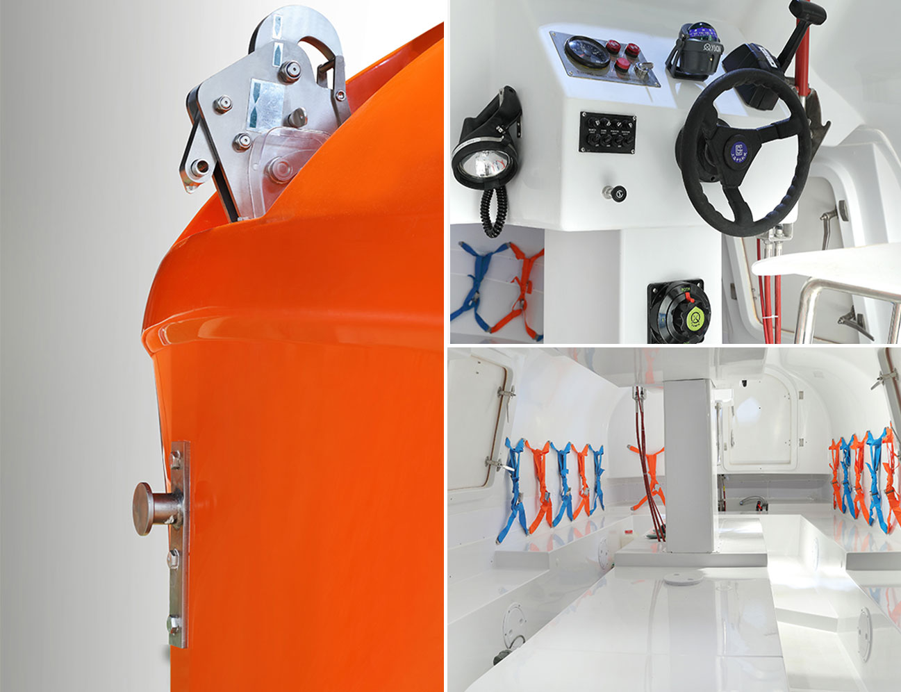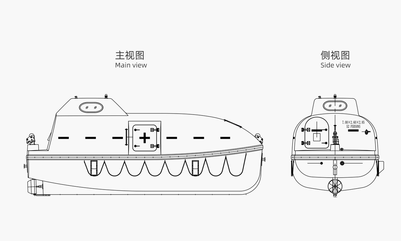 本艇的設(shè)計(jì)、制造和試驗(yàn)完全符合經(jīng)MSC.226(82)、MSC.274(85)、MSC.321(89)和MSC.323(89)修正的MSC.81(70)《經(jīng)修正的就生設(shè)備試驗(yàn)建議》第1部分;1974年國際海上人命安全公約及其修正案第Ⅲ章第21、31、34條;以及經(jīng)MSC.218(82)、MSC.272(85)、MSC.320(89)修正的MSC.48(66)《國際救生設(shè)備規(guī)則》第Ⅳ、Ⅴ章的要求;具備救生、救助兼用功能,適合在較惡劣海況下使用,如遠(yuǎn)洋客貨輪及油輪等,同時(shí)也適用于石油鉆井平臺(tái)、軍艦平臺(tái)等。 艇體為具有高耐燃特性的阻燃型玻璃鋼;供人員行走的表面均為防滑面;艇內(nèi)裝有可排除艇內(nèi)積水手搖泵;艇上裝有不銹鋼吊鉤系統(tǒng),采用吊艇索下放或回收;本艇可滿載全速航行大于24小時(shí),在滿載情況下可達(dá)到6節(jié)航速。 本艇有普通型和耐火型兩種規(guī)格,其中耐火型救生艇裝有灑水系統(tǒng),由主機(jī)水泵帶動(dòng)從艇最低處抽取海水,確保沒有易燃液體進(jìn)入系統(tǒng),灑水系統(tǒng)能提供足夠的水,噴灑于艇的表面;耐火型救生艇還裝有供氣系統(tǒng),可提供足夠的的空氣滿足全體乘員和柴油機(jī)全速運(yùn)轉(zhuǎn)至少8分鐘,能在艇內(nèi)形成一個(gè)超壓狀態(tài)以阻止有毒有害氣體的進(jìn)入。